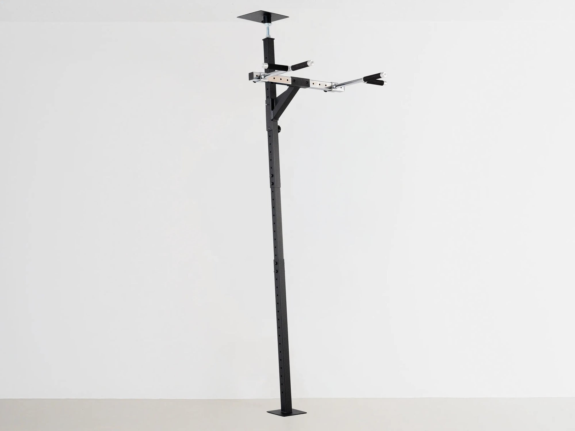 天井と床を突っ張るだけで簡単に設置ができます。ぶら下がっても手前に倒れないよう85度の傾斜角がついており、強く突っ張る必要はございません。もちろん工事も不要です。